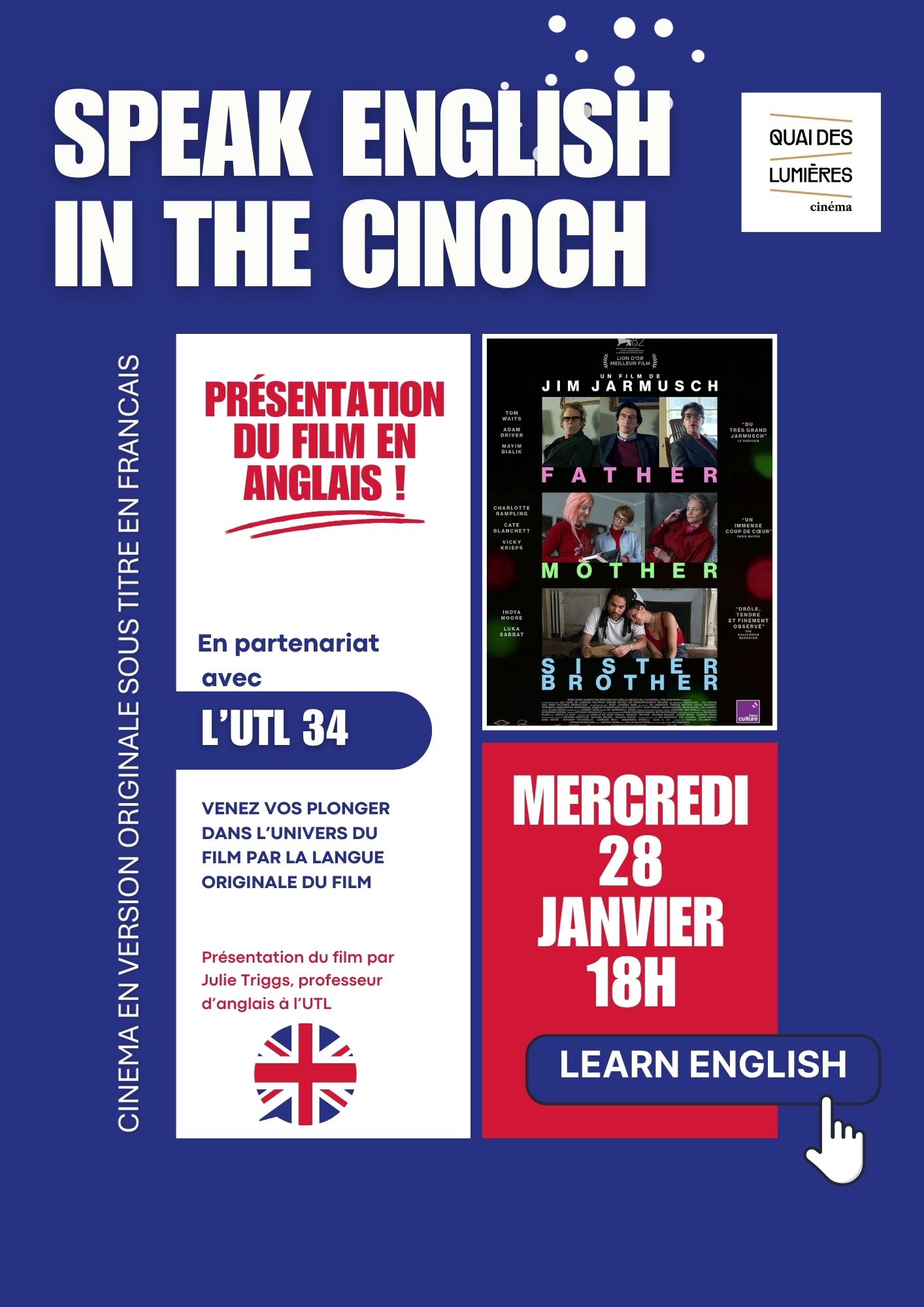 28 janvier Partenariat avec le cinéma « Quai des lumières » : « Father Mother Sister Brother » le mercredi 28 janvier à 18h, séance en anglais présentée en anglais par Julie Triggs professeure d’anglais de l’UTL34, film en version originale et sous-titré en français