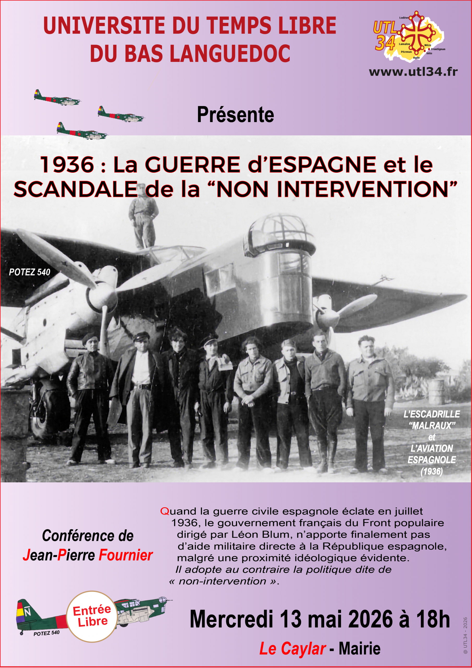 13 mai Conférence : « 1936 : La guerre d’Espagne et le scandale de la « Non intervention » » par Jean-Pierre FOURNIER