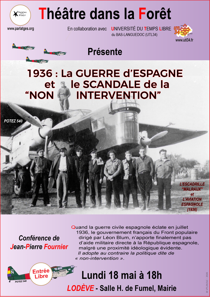 18 mai Conférence : « 1936 : La guerre d’Espagne et le scandale de la « Non intervention » » par Jean-Pierre FOURNIER en collaboration avec le Théâtre dans la Forêt